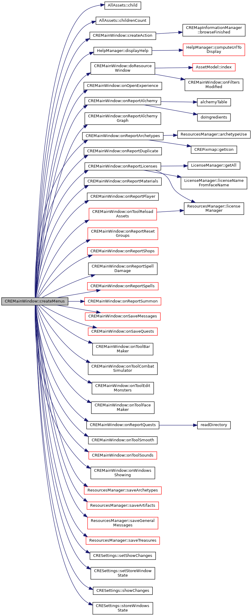 References AllAssets::child(), AllAssets::childrenCount(), createAction(), HelpManager::displayHelp(), AssetWrapper::displayName, doResourceWindow(), myArea, myAssets, myChanges, myClearMapCache, myHelpManager, myOpenMenu, myResourcesManager, mySaveFormulae, mySaveMenu, myToolsMenu, myWindows, onOpenExperience(), onReportAlchemy(), onReportAlchemyGraph(), onReportArchetypes(), onReportDuplicate(), onReportLicenses(), onReportMaterials(), onReportPlayer(), onReportQuests(), onReportResetGroups(), onReportShops(), onReportSpellDamage(), onReportSpells(), onReportSummon(), onSaveMessages(), onSaveQuests(), onToolBarMaker(), onToolCombatSimulator(), onToolEditMonsters(), onToolFaceMaker(), onToolReloadAssets(), onToolSmooth(), onToolSounds(), onWindowsShowing(), ResourcesManager::saveArchetypes(), ResourcesManager::saveArtifacts(), ResourcesManager::saveGeneralMessages(), ResourcesManager::saveTreasures(), CRESettings::setShowChanges(), CRESettings::setStoreWindowState(), CRESettings::showChanges(), CRESettings::storeWindowsState(), and AssetWrapper::tipProperty.