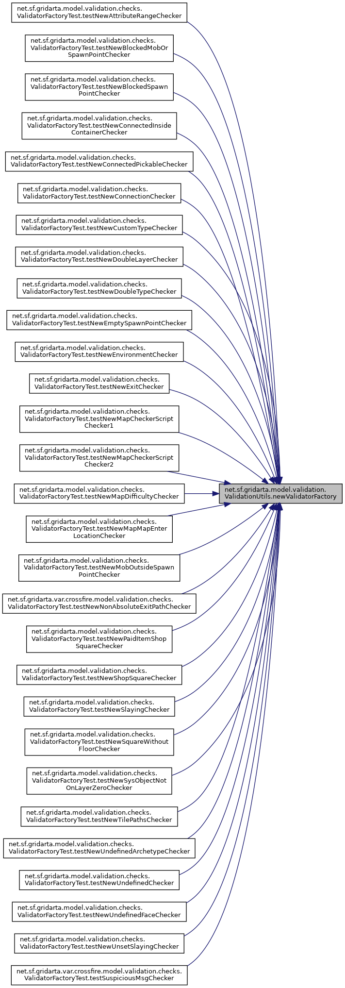 Referenced by net.sf.gridarta.model.validation.checks.ValidatorFactoryTest.testNewAttributeRangeChecker(), net.sf.gridarta.model.validation.checks.ValidatorFactoryTest.testNewBlockedMobOrSpawnPointChecker(), net.sf.gridarta.model.validation.checks.ValidatorFactoryTest.testNewBlockedSpawnPointChecker(), net.sf.gridarta.model.validation.checks.ValidatorFactoryTest.testNewConnectedInsideContainerChecker(), net.sf.gridarta.model.validation.checks.ValidatorFactoryTest.testNewConnectedPickableChecker(), net.sf.gridarta.model.validation.checks.ValidatorFactoryTest.testNewConnectionChecker(), net.sf.gridarta.model.validation.checks.ValidatorFactoryTest.testNewCustomTypeChecker(), net.sf.gridarta.model.validation.checks.ValidatorFactoryTest.testNewDoubleLayerChecker(), net.sf.gridarta.model.validation.checks.ValidatorFactoryTest.testNewDoubleTypeChecker(), net.sf.gridarta.model.validation.checks.ValidatorFactoryTest.testNewEmptySpawnPointChecker(), net.sf.gridarta.model.validation.checks.ValidatorFactoryTest.testNewEnvironmentChecker(), net.sf.gridarta.model.validation.checks.ValidatorFactoryTest.testNewExitChecker(), net.sf.gridarta.model.validation.checks.ValidatorFactoryTest.testNewMapCheckerScriptChecker1(), net.sf.gridarta.model.validation.checks.ValidatorFactoryTest.testNewMapCheckerScriptChecker2(), net.sf.gridarta.model.validation.checks.ValidatorFactoryTest.testNewMapDifficultyChecker(), net.sf.gridarta.model.validation.checks.ValidatorFactoryTest.testNewMapMapEnterLocationChecker(), net.sf.gridarta.model.validation.checks.ValidatorFactoryTest.testNewMobOutsideSpawnPointChecker(), net.sf.gridarta.var.crossfire.model.validation.checks.ValidatorFactoryTest.testNewNonAbsoluteExitPathChecker(), net.sf.gridarta.model.validation.checks.ValidatorFactoryTest.testNewPaidItemShopSquareChecker(), net.sf.gridarta.model.validation.checks.ValidatorFactoryTest.testNewShopSquareChecker(), net.sf.gridarta.model.validation.checks.ValidatorFactoryTest.testNewSlayingChecker(), net.sf.gridarta.model.validation.checks.ValidatorFactoryTest.testNewSquareWithoutFloorChecker(), net.sf.gridarta.model.validation.checks.ValidatorFactoryTest.testNewSysObjectNotOnLayerZeroChecker(), net.sf.gridarta.model.validation.checks.ValidatorFactoryTest.testNewTilePathsChecker(), net.sf.gridarta.model.validation.checks.ValidatorFactoryTest.testNewUndefinedArchetypeChecker(), net.sf.gridarta.model.validation.checks.ValidatorFactoryTest.testNewUndefinedChecker(), net.sf.gridarta.model.validation.checks.ValidatorFactoryTest.testNewUndefinedFaceChecker(), net.sf.gridarta.model.validation.checks.ValidatorFactoryTest.testNewUnsetSlayingChecker(), and net.sf.gridarta.var.crossfire.model.validation.checks.ValidatorFactoryTest.testSuspiciousMsgChecker().
