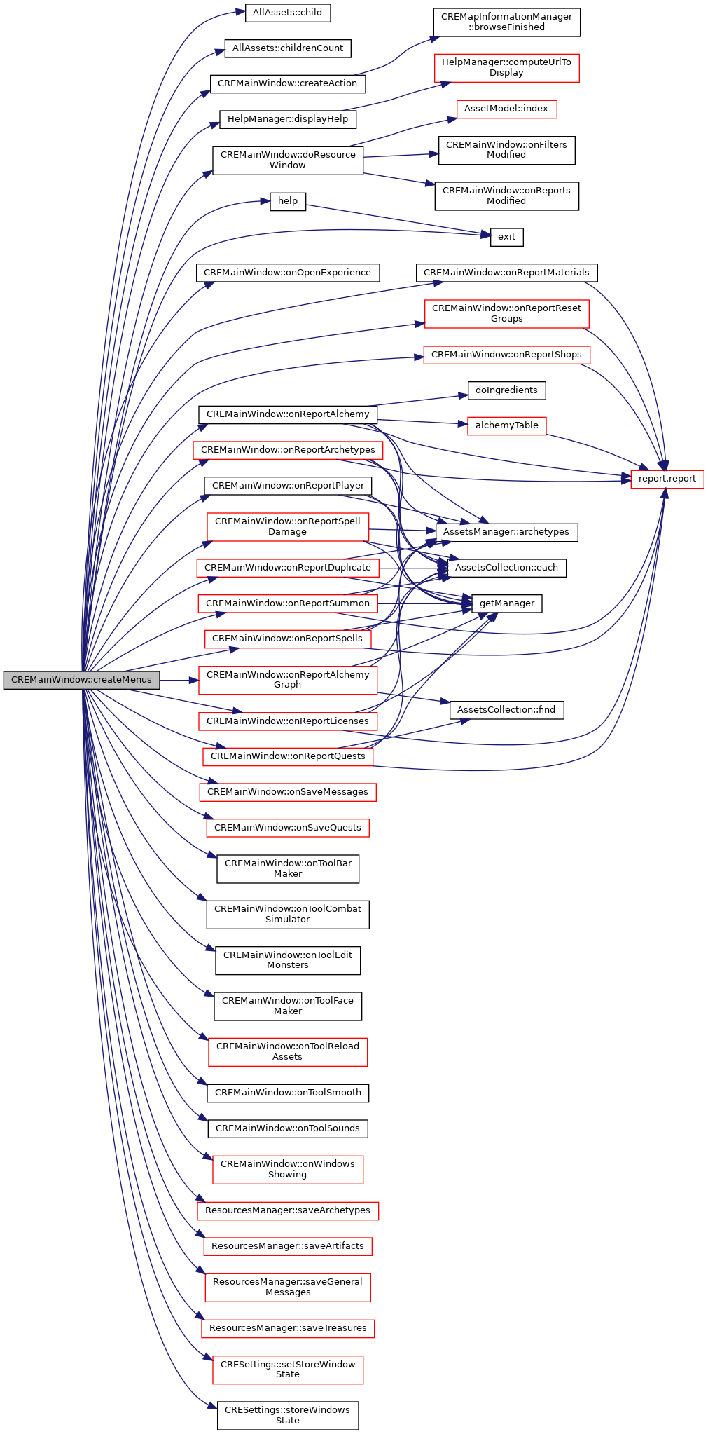 References convert::action, AllAssets::child(), AllAssets::childrenCount(), createAction(), HelpManager::displayHelp(), AssetWrapper::displayName, doResourceWindow(), exit(), help(), npc_dialog::index, myArea, myAssets, myChanges, myClearMapCache, myHelpManager, myOpenMenu, myResourcesManager, mySaveFormulae, mySaveMenu, myToolsMenu, myWindows, name, onOpenExperience(), onReportAlchemy(), onReportAlchemyGraph(), onReportArchetypes(), onReportDuplicate(), onReportLicenses(), onReportMaterials(), onReportPlayer(), onReportQuests(), onReportResetGroups(), onReportShops(), onReportSpellDamage(), onReportSpells(), onReportSummon(), onSaveMessages(), onSaveQuests(), onToolBarMaker(), onToolCombatSimulator(), onToolEditMonsters(), onToolFaceMaker(), onToolReloadAssets(), onToolSmooth(), onToolSounds(), onWindowsShowing(), ResourcesManager::saveArchetypes(), ResourcesManager::saveArtifacts(), ResourcesManager::saveGeneralMessages(), ResourcesManager::saveTreasures(), CRESettings::setStoreWindowState(), settings, CRESettings::storeWindowsState(), and AssetWrapper::tipProperty.