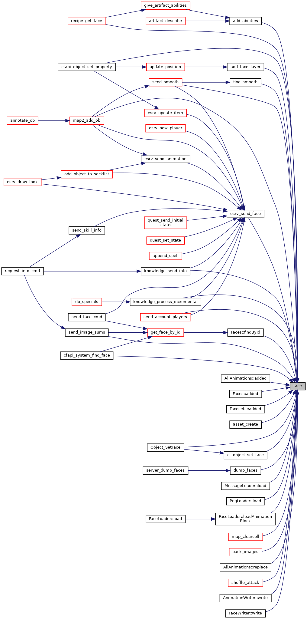 Referenced by add_abilities(), add_face_layer(), AllAnimations::added(), Faces::added(), Facesets::added(), asset_create(), cf_object_set_face(), cfapi_object_set_property(), cfapi_system_find_face(), dump_faces(), esrv_send_face(), find_smooth(), Faces::findById(), knowledge_process_incremental(), knowledge_send_info(), MessageLoader::load(), PngLoader::load(), FaceLoader::loadAnimationBlock(), map2_add_ob(), map_clearcell(), Object_SetFace(), pack_images(), recipe_get_face(), AllAnimations::replace(), send_account_players(), send_image_sums(), send_smooth(), shuffle_attack(), AnimationWriter::write(), and FaceWriter::write().