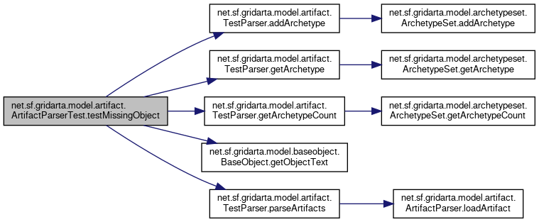 Here is the call graph for this function:| void net.sf.gridarta.model.artifact.ArtifactParserTest.testMissingObject | ( | ) | throws DuplicateArchetypeException, IOException, UndefinedArchetypeException |
