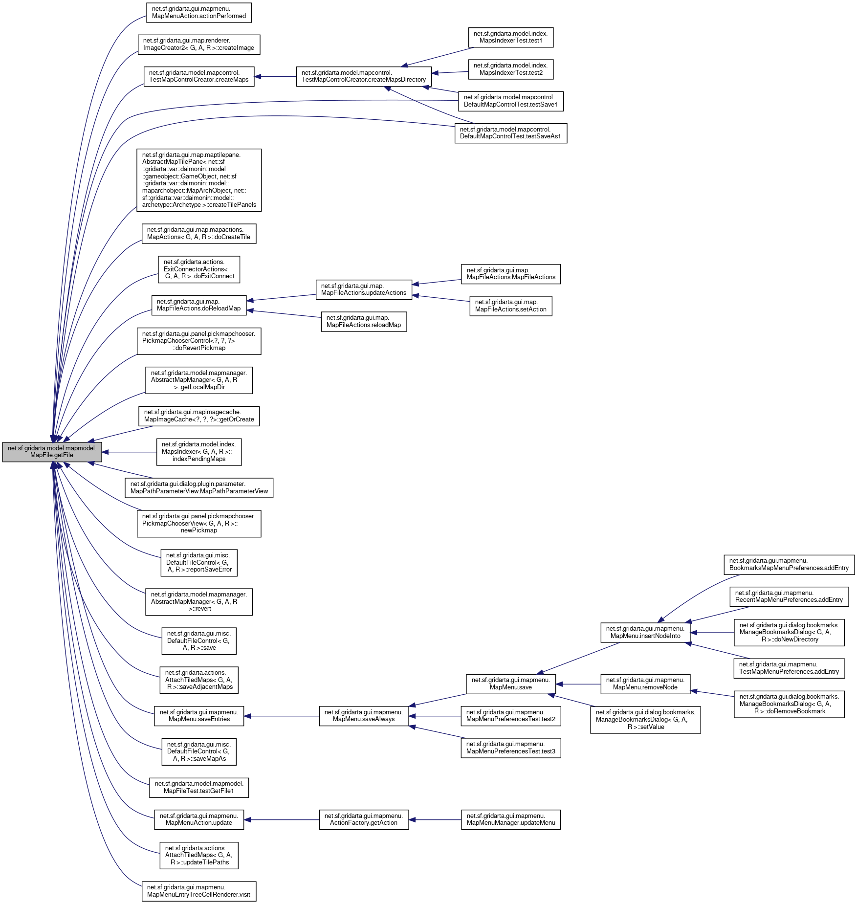 Referenced by net.sf.gridarta.gui.mapmenu.MapMenuAction.actionPerformed(), net.sf.gridarta.gui.map.renderer.ImageCreator2< G, A, R >.createImage(), net.sf.gridarta.model.mapcontrol.TestMapControlCreator.createMaps(), net.sf.gridarta.gui.map.maptilepane.AbstractMapTilePane< net.sf.gridarta.var.daimonin.model.gameobject.GameObject, net.sf.gridarta.var.daimonin.model.maparchobject.MapArchObject, net.sf.gridarta.var.daimonin.model.archetype.Archetype >.createTilePanels(), net.sf.gridarta.gui.map.mapactions.MapActions< G, A, R >.doCreateTile(), net.sf.gridarta.actions.ExitConnectorActions< G, A, R >.doExitConnect(), net.sf.gridarta.gui.map.MapFileActions< G extends GameObject< G, A, R, A extends MapArchObject< A, R extends Archetype< G, A, R >.doReloadMap(), net.sf.gridarta.gui.panel.pickmapchooser.PickmapChooserControl<?, ?, ?>.doRevertPickmap(), net.sf.gridarta.model.mapmanager.AbstractMapManager< G, A, R >.getLocalMapDir(), net.sf.gridarta.gui.mapimagecache.MapImageCache<?, ?, ?>.getOrCreate(), net.sf.gridarta.model.index.MapsIndexer< G, A, R >.indexPendingMaps(), net.sf.gridarta.gui.dialog.plugin.parameter.MapPathParameterView< G extends GameObject< G, A, R, A extends MapArchObject< A, R extends Archetype< G, A, R >.MapPathParameterView(), net.sf.gridarta.gui.panel.pickmapchooser.PickmapChooserView< G, A, R >.newPickmap(), net.sf.gridarta.gui.misc.DefaultFileControl< G, A, R >.reportSaveError(), net.sf.gridarta.model.mapmanager.AbstractMapManager< G, A, R >.revert(), net.sf.gridarta.gui.misc.DefaultFileControl< G, A, R >.save(), net.sf.gridarta.actions.AttachTiledMaps< G, A, R >.saveAdjacentMaps(), net.sf.gridarta.gui.mapmenu.MapMenu.saveEntries(), net.sf.gridarta.gui.misc.DefaultFileControl< G, A, R >.saveMapAs(), net.sf.gridarta.model.mapmodel.MapFileTest.testGetFile1(), net.sf.gridarta.model.mapcontrol.DefaultMapControlTest.testSave1(), net.sf.gridarta.model.mapcontrol.DefaultMapControlTest.testSaveAs1(), net.sf.gridarta.gui.mapmenu.MapMenuAction.update(), net.sf.gridarta.actions.AttachTiledMaps< G, A, R >.updateTilePaths(), and net.sf.gridarta.gui.mapmenu.MapMenuEntryTreeCellRenderer.visit().