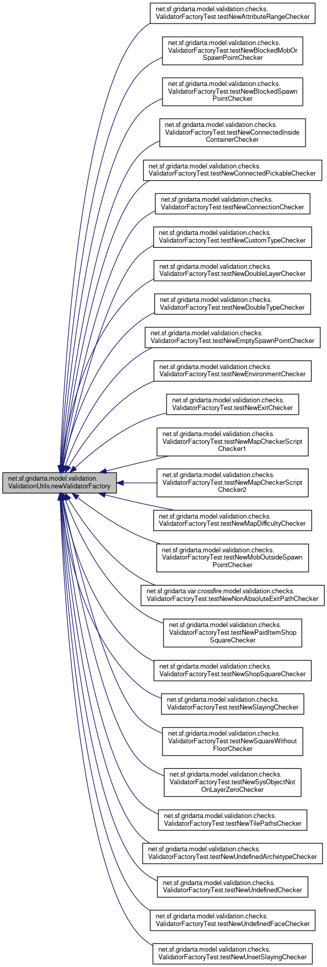 Referenced by net.sf.gridarta.model.validation.checks.ValidatorFactoryTest.testNewAttributeRangeChecker(), net.sf.gridarta.model.validation.checks.ValidatorFactoryTest.testNewBlockedMobOrSpawnPointChecker(), net.sf.gridarta.model.validation.checks.ValidatorFactoryTest.testNewBlockedSpawnPointChecker(), net.sf.gridarta.model.validation.checks.ValidatorFactoryTest.testNewConnectedInsideContainerChecker(), net.sf.gridarta.model.validation.checks.ValidatorFactoryTest.testNewConnectedPickableChecker(), net.sf.gridarta.model.validation.checks.ValidatorFactoryTest.testNewConnectionChecker(), net.sf.gridarta.model.validation.checks.ValidatorFactoryTest.testNewCustomTypeChecker(), net.sf.gridarta.model.validation.checks.ValidatorFactoryTest.testNewDoubleLayerChecker(), net.sf.gridarta.model.validation.checks.ValidatorFactoryTest.testNewDoubleTypeChecker(), net.sf.gridarta.model.validation.checks.ValidatorFactoryTest.testNewEmptySpawnPointChecker(), net.sf.gridarta.model.validation.checks.ValidatorFactoryTest.testNewEnvironmentChecker(), net.sf.gridarta.model.validation.checks.ValidatorFactoryTest.testNewExitChecker(), net.sf.gridarta.model.validation.checks.ValidatorFactoryTest.testNewMapCheckerScriptChecker1(), net.sf.gridarta.model.validation.checks.ValidatorFactoryTest.testNewMapCheckerScriptChecker2(), net.sf.gridarta.model.validation.checks.ValidatorFactoryTest.testNewMapDifficultyChecker(), net.sf.gridarta.model.validation.checks.ValidatorFactoryTest.testNewMobOutsideSpawnPointChecker(), net.sf.gridarta.var.crossfire.model.validation.checks.ValidatorFactoryTest.testNewNonAbsoluteExitPathChecker(), net.sf.gridarta.model.validation.checks.ValidatorFactoryTest.testNewPaidItemShopSquareChecker(), net.sf.gridarta.model.validation.checks.ValidatorFactoryTest.testNewShopSquareChecker(), net.sf.gridarta.model.validation.checks.ValidatorFactoryTest.testNewSlayingChecker(), net.sf.gridarta.model.validation.checks.ValidatorFactoryTest.testNewSquareWithoutFloorChecker(), net.sf.gridarta.model.validation.checks.ValidatorFactoryTest.testNewSysObjectNotOnLayerZeroChecker(), net.sf.gridarta.model.validation.checks.ValidatorFactoryTest.testNewTilePathsChecker(), net.sf.gridarta.model.validation.checks.ValidatorFactoryTest.testNewUndefinedArchetypeChecker(), net.sf.gridarta.model.validation.checks.ValidatorFactoryTest.testNewUndefinedChecker(), net.sf.gridarta.model.validation.checks.ValidatorFactoryTest.testNewUndefinedFaceChecker(), and net.sf.gridarta.model.validation.checks.ValidatorFactoryTest.testNewUnsetSlayingChecker().